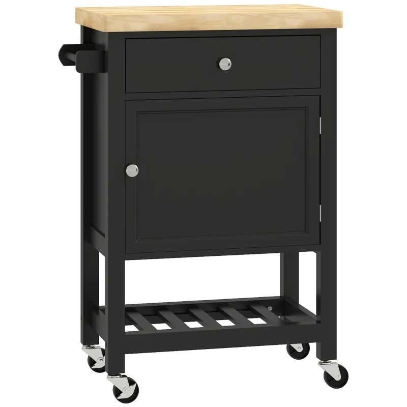 HOMCOM Küchenrollwagen auf Rollen, Servierwagen, Arbeitsplatte aus Gummibaumholz, Schublade, 63,5 x 40 x 90 cm, schwarz