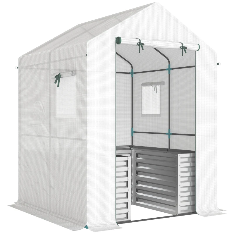 Outsunny Tomatengewächshaus Foliengewächshaus mit Hochbeet Rolltor Fenster Schrägdach 141 x 141 x 190 cm Weiß